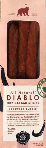 Diablo Dry Salami is inspired by the traditional flavors of Salame Piccante from the southern region of Italy. Handcrafted using an old recipe from Cosenza. Premium cuts of all natural whole muscle pork are coarsely ground and generously spiced with paprika and red pepper flakes imported from Calabria. Red wine and fennel are added to the mix to add an extra layer of flavor. The salami is fermented and dried for several weeks until a perfect balance of bite and flavor is achieved. The finished salami is spicy and flavorful but not too hot. Available in three 4oz sticks.